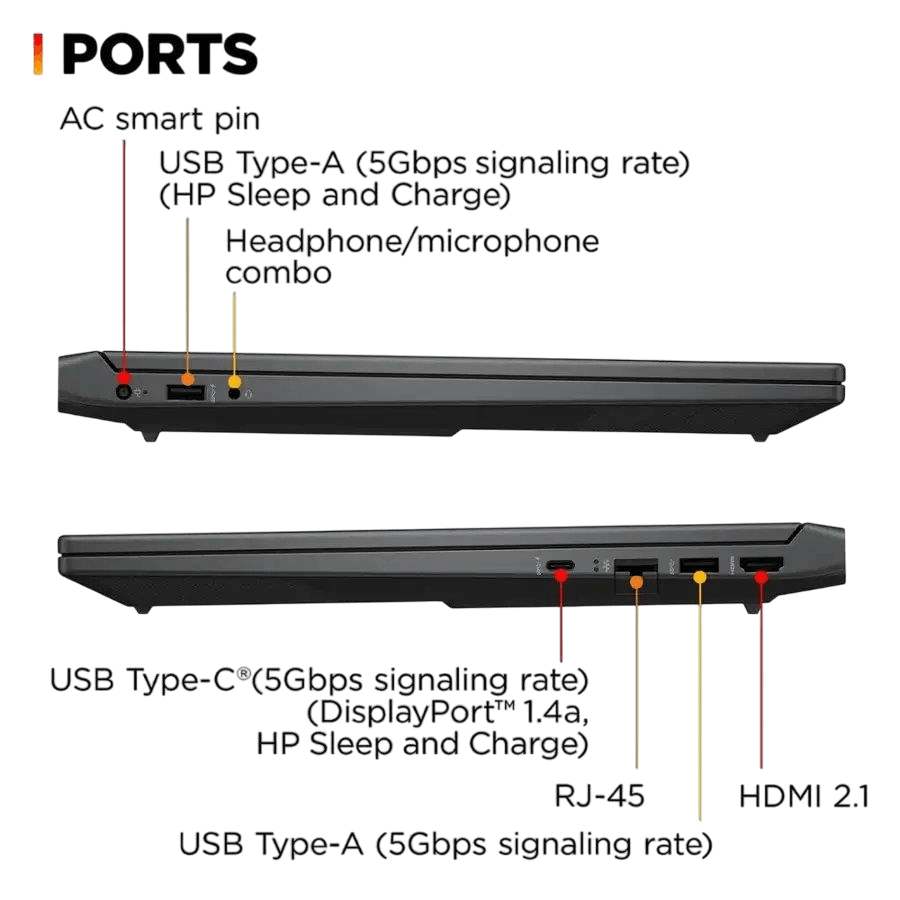 Ports | 1 USB Type-A 5Gbps signaling rate (HP Sleep and Charge); 1 USB Type-A 5Gbps signaling rate; 1 AC smart pin; 1 HDMI 2.1; 1 headphone/microphone combo; 1 RJ-45; 1 USB Type-C® 5Gbps signaling rate (DisplayPort™ 1.4a, HP Sleep and Charge) |
